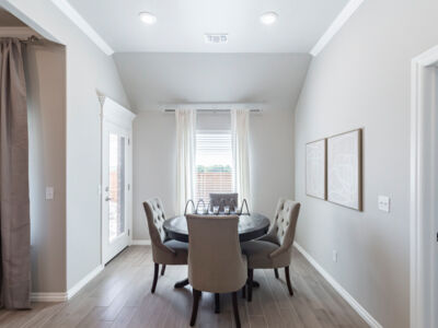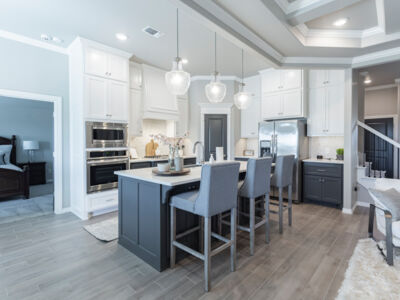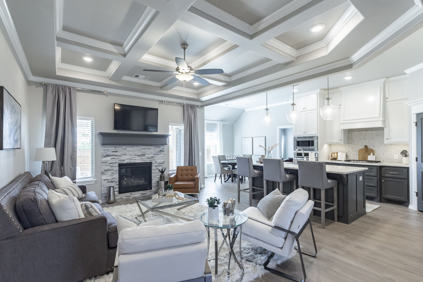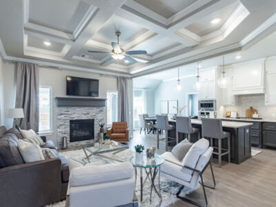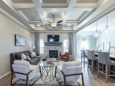 Once back down the stairs, you will find yourself in the home’s open area common space with 10-foot ceilings flowing through the airy living room, large kitchen, and dining room. On the back wall sits a flip switch gas fireplace with a stone surround accompanied by two oversized windows that allow in an abundance of natural light into the area.