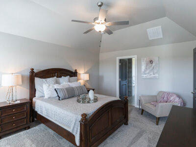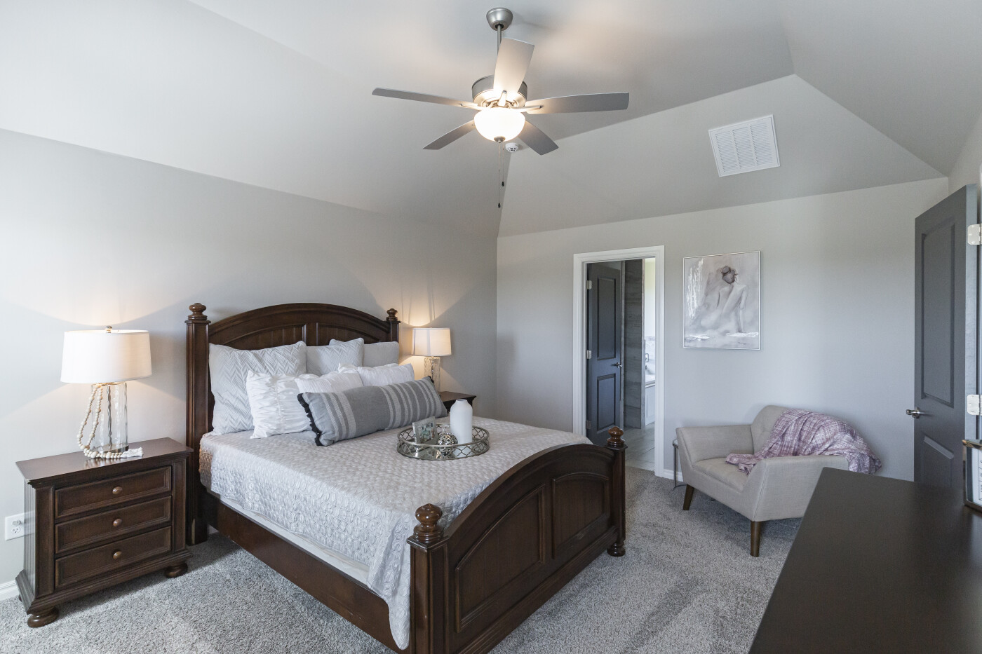 The primary suite allows privacy from the rest of the bedrooms on the opposite side of the home. This spacious bedroom will be complete with a sloped ceiling to maximize space and comfort in the room along with the two windows used for natural lighting. The spa-like bathroom within the primary suite has a tub and sauna-style step-in shower so you can unwind after your long day. Custom cabinetry and granite countertops on the dual vanities are also included, as well as a four-season walk-in closet that expands the width of the bathroom.