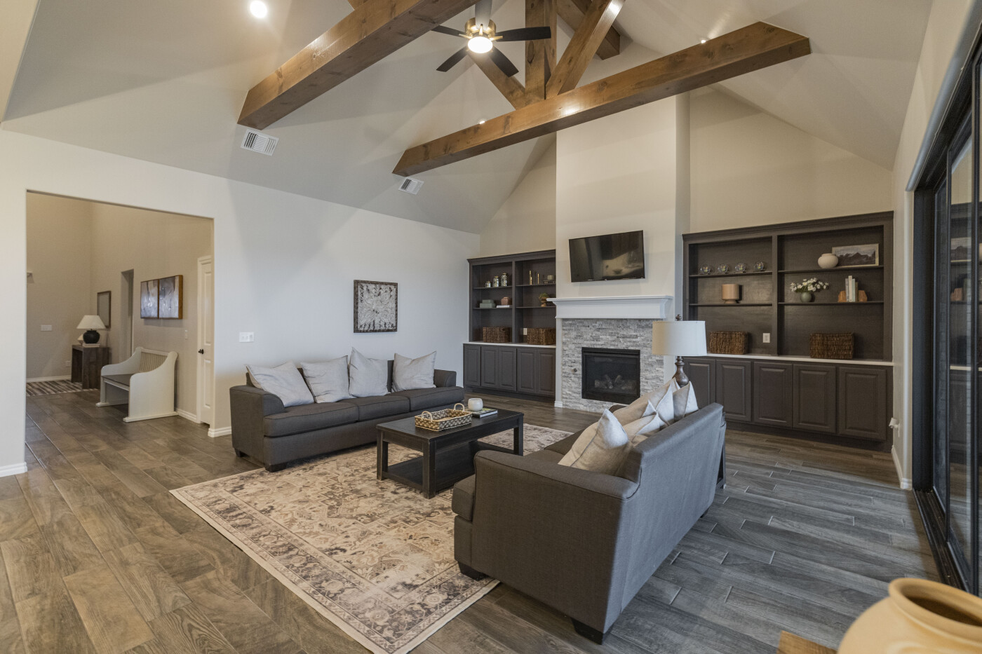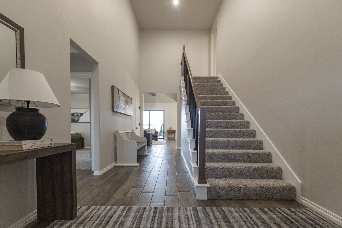 Through the kitchen leads another hallway containing the large walk-in pantry, a powder room, mud bench, coat closet, and entry to the utility room and garage. The primary suite is also located off this hallway, offering easy access from the garage and easy access drop zones.