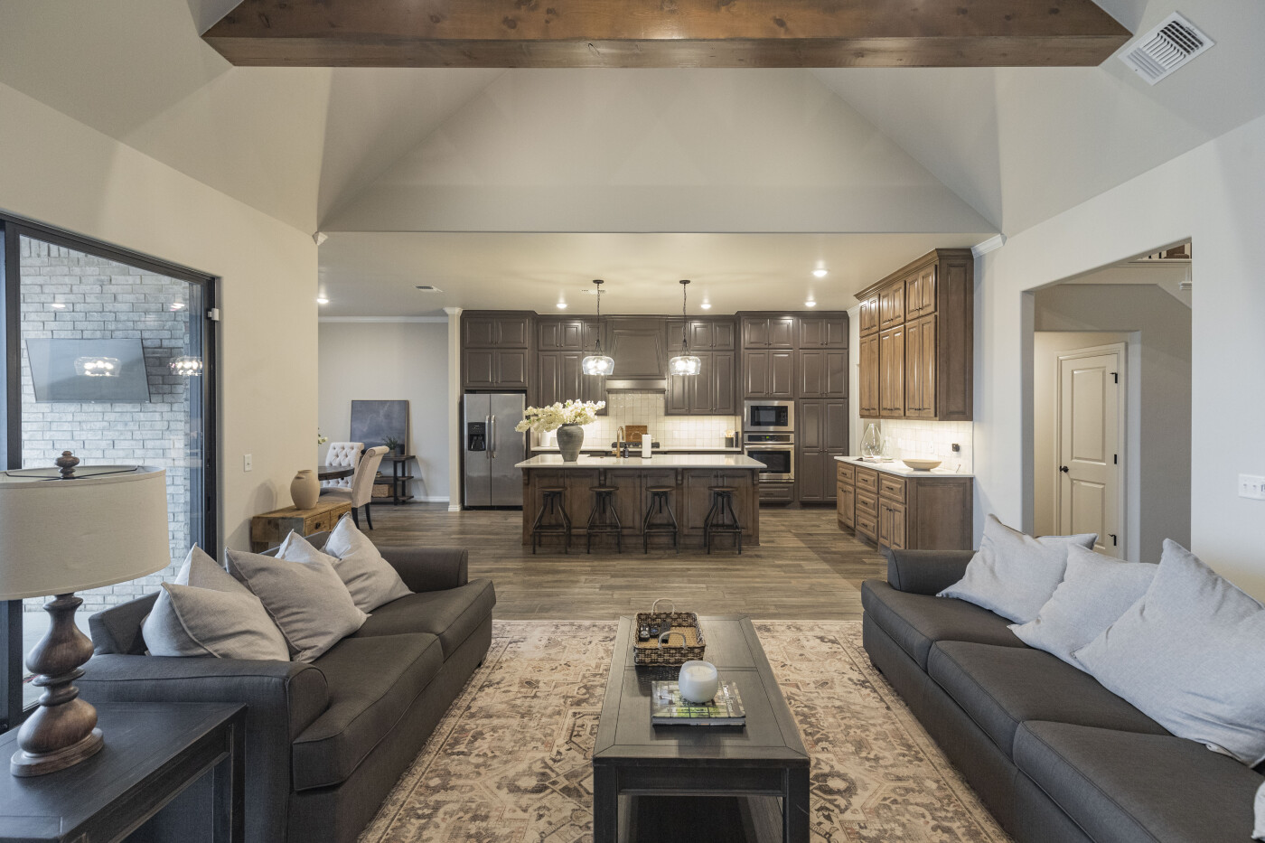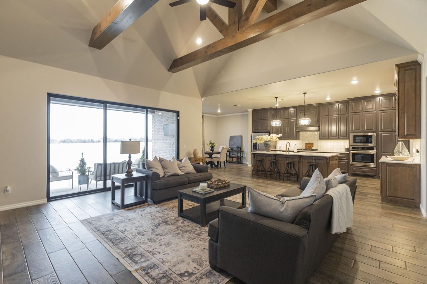 Journeying back down the main staircase, you will make your way through the grand entry to find the home's main attraction. Thanks to the large windows overlooking the covered patio with an outdoor fireplace, you will immediately notice how light and bright the home is. The ceilings throughout the kitchen, living room and dining room are 10 feet tall, adding to the magnificent aura of the home. The living area offers an included electric gas fireplace as the room's focal point. The kitchen and dining area are steps away and provide a comprehensive view of the main area, perfect for entertainment or family gatherings.
