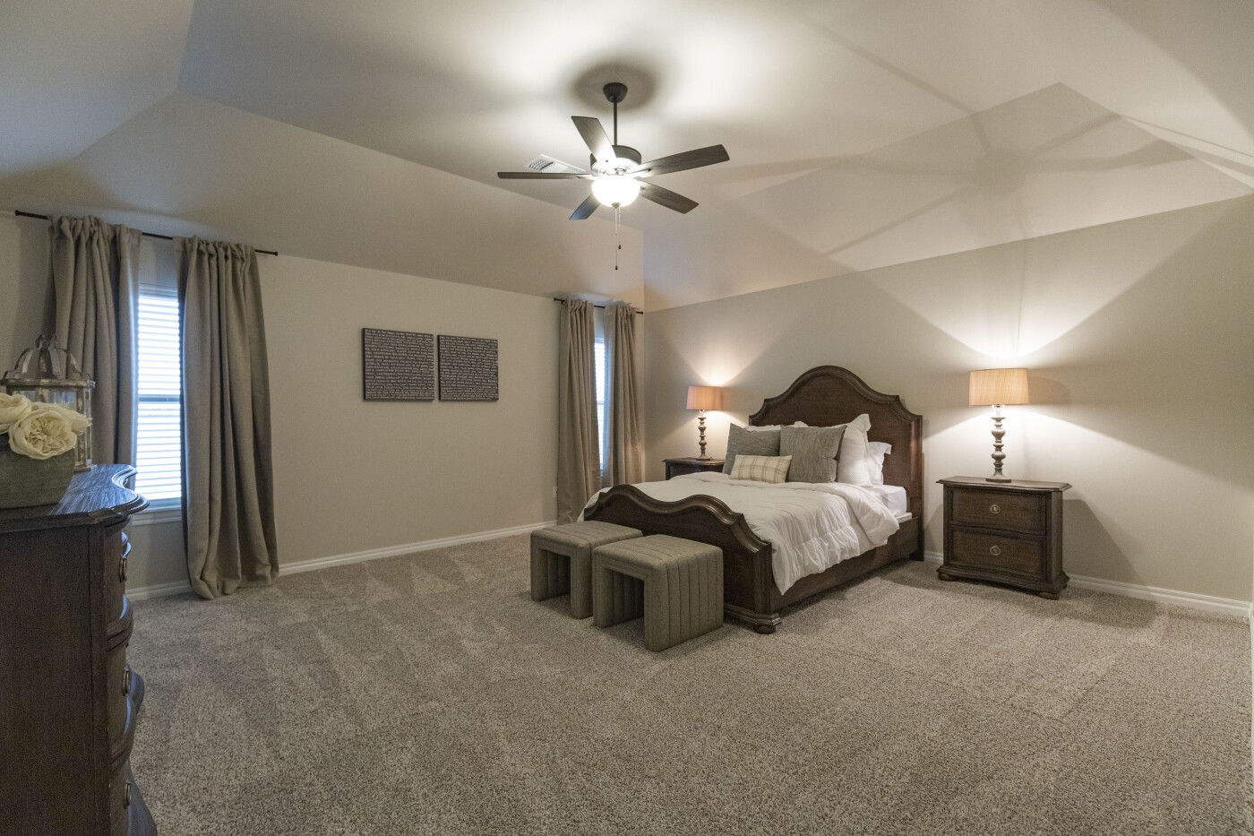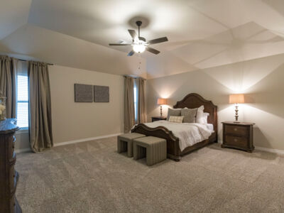 The primary bedroom boasts 10-foot ceilings and a surplus of space. The bathroom suite has counter space galore with dual sinks that make morning routines easy. There is also a walk-in shower and separate toilet room. The four-season closet connects to the utility room, which makes storing seasonal clothing easy and putting away laundry a breeze.