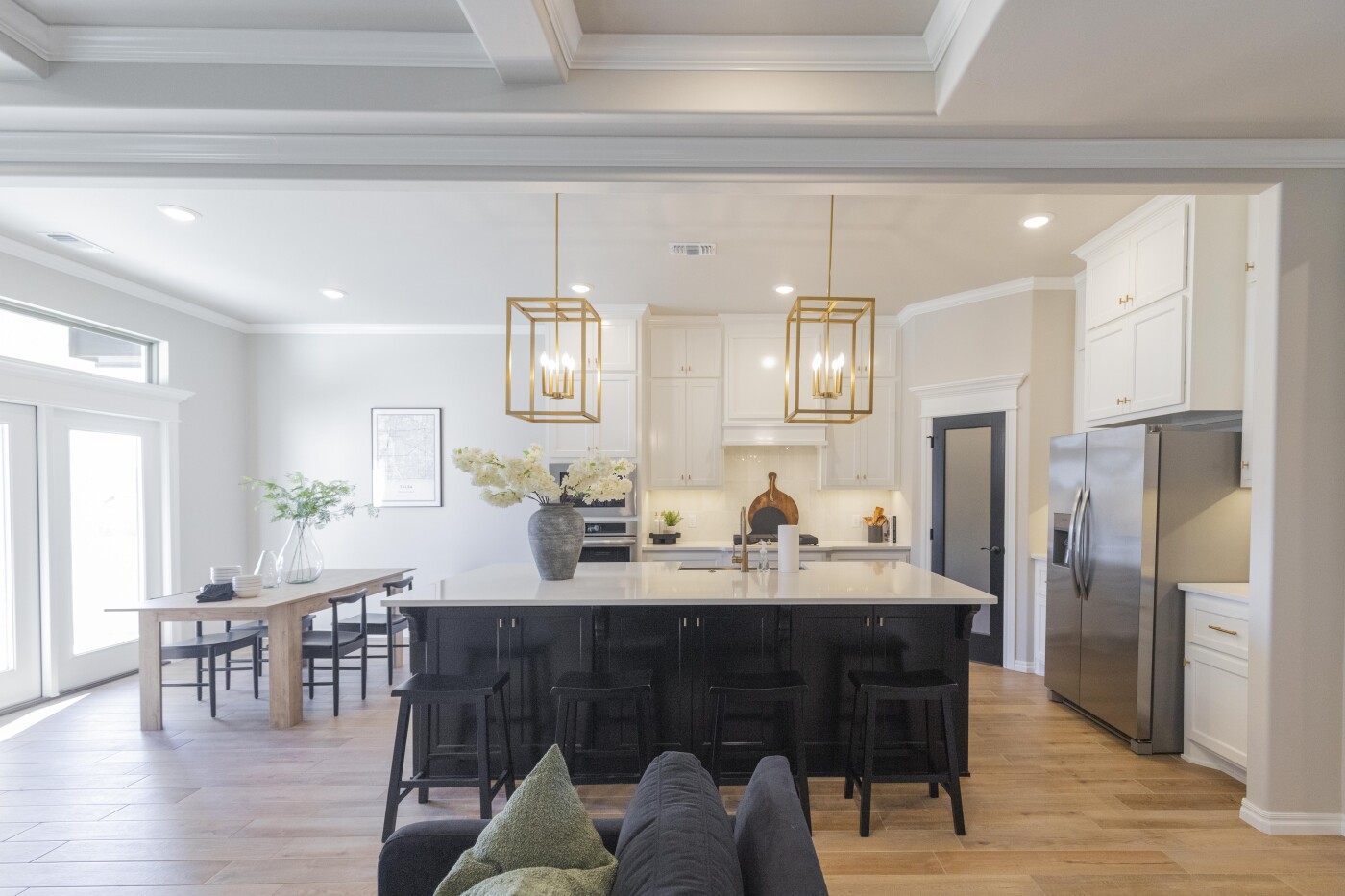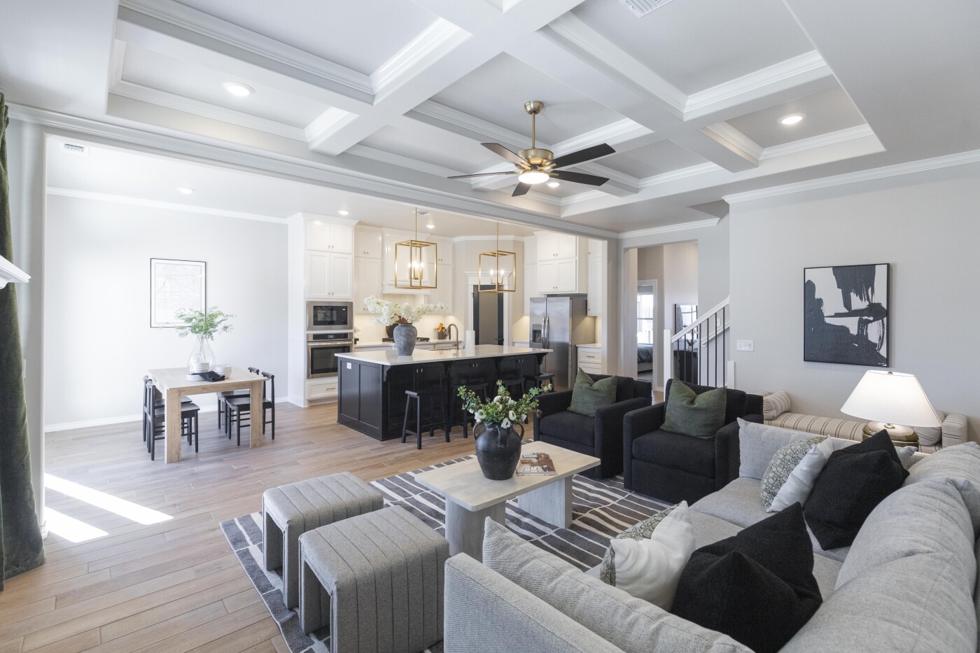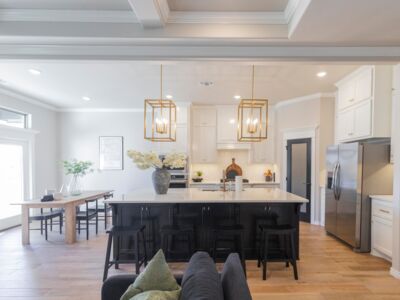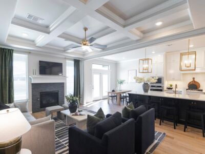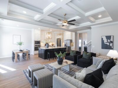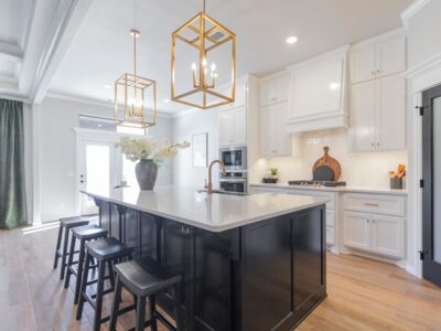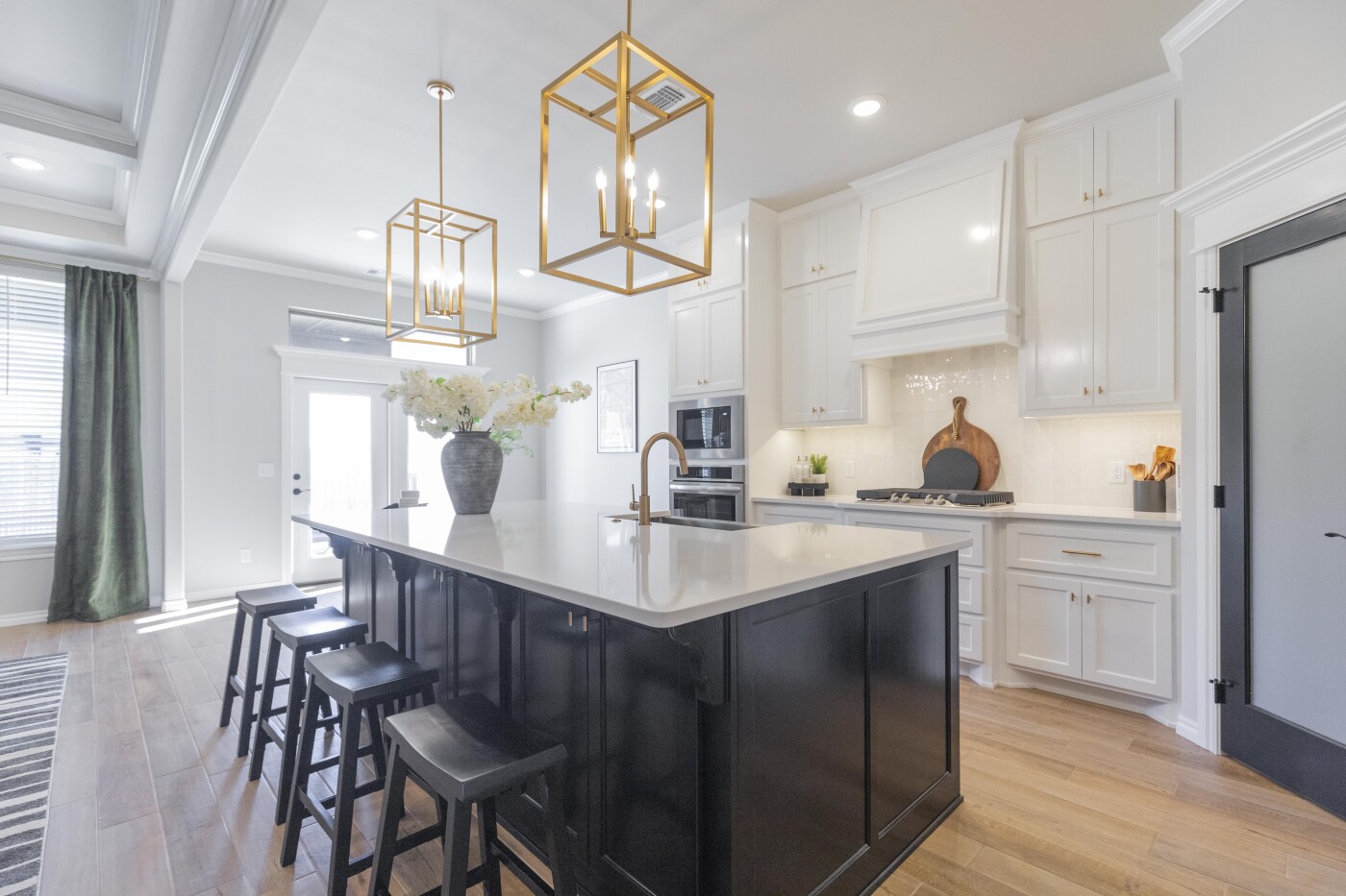 The center island kitchen is both stylish and functional. The oversized island with breakfast bar offers ample prep and serving counter space. Our standard for this home gives you a gas cooktop with an oversized hooded vent that’s vented to the exterior. We also incorporate a built-in electric oven and microwave, for easier access, plus granite or quartz counters, stainless steel appliances, tile backsplash, stainless steel farm sink, and cabinetry that reaches to the ceiling and features under-cabinet lighting below. The walk-in pantry expands the storage space, and we finish this gourmet kitchen with beautiful hardware and decorative end panels.