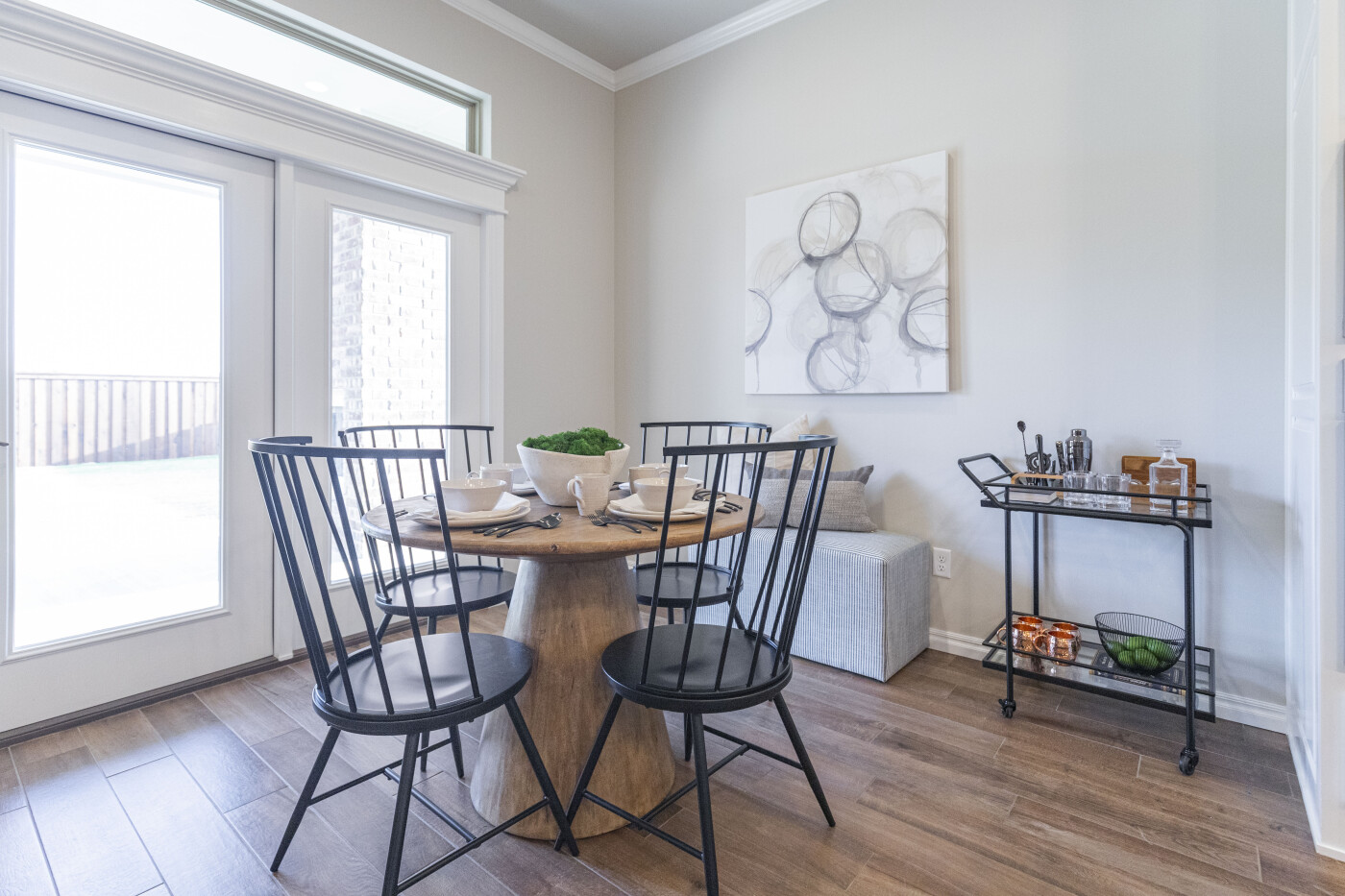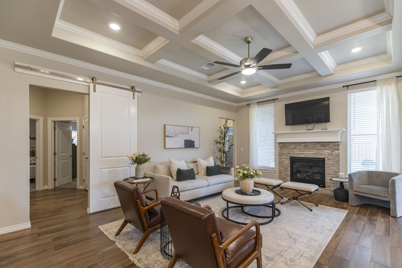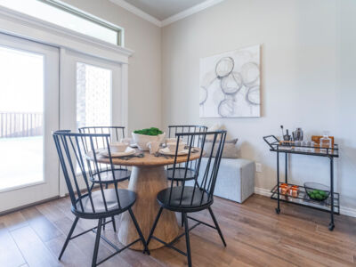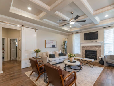 The entry with the 10-foot ceiling guides you to the spacious open floor plan. A stone-surround, gas fireplace provides the focal point on the back wall, where it can be enjoyed from anywhere in the spacious area. The dining room opens to your covered patio, where you can relax, entertain, or both. We include an outdoor wood-burning fireplace to keep you warm when you need it, a gas line to hook up your grill, and a cable outlet so you don’t miss your favorite shows.