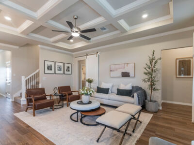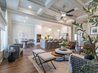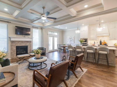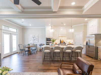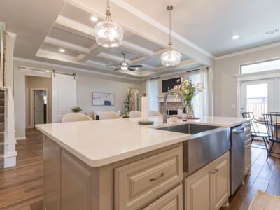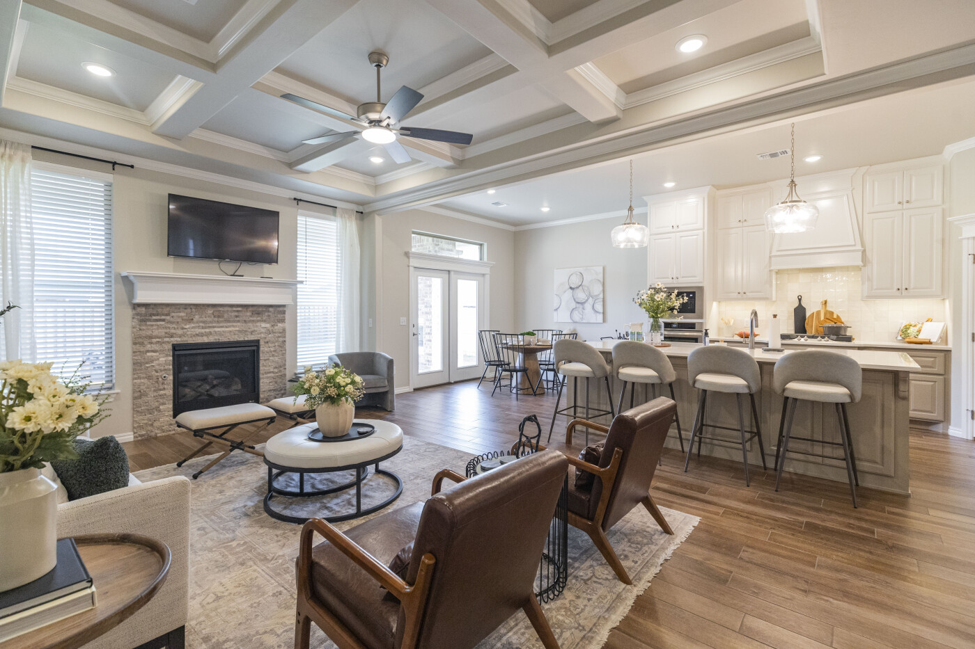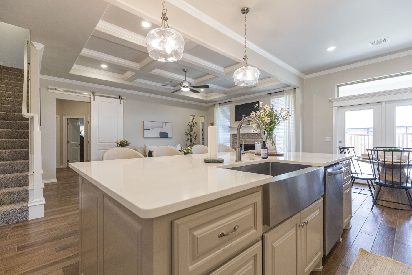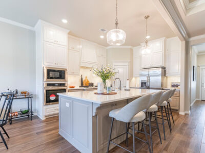 The center island kitchen is both stylish and functional. The oversized island with breakfast bar offers ample prep and serving counter space. Our standard for this home gives you a gas cooktop with an oversized hooded vent that’s vented to the exterior. We also incorporate a built-in electric oven and microwave, for easier access, plus granite or quartz counters, stainless steel appliances, tile backsplash, stainless steel farm sink, and cabinetry that reaches to the ceiling and features under-cabinet lighting below. The walk-in pantry expands the storage space, and we finish this gourmet kitchen with beautiful hardware and decorative end panels.