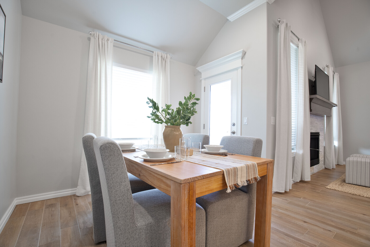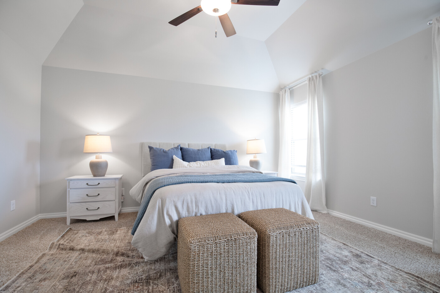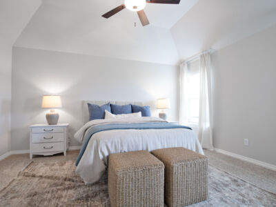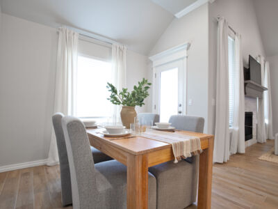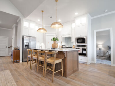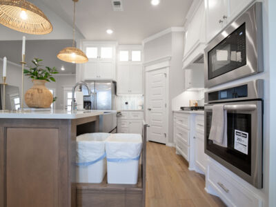 The kitchen holds a charming feel with its sizable, freestanding island that welcomes family gatherings or additional counter space for dinner preparation and serving. The decorative lighting above adds another artistic touch to the space and the upgraded tile backsplash and granite or quartz countertops throughout. In the corner, you will find a full-sized pantry that provides ample space for food and additional kitchen storage. The stainless-steel appliances are built into the custom cabinetry to remove wasted space and maintain that hassle-free atmosphere.