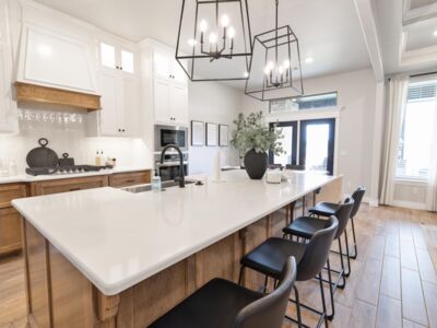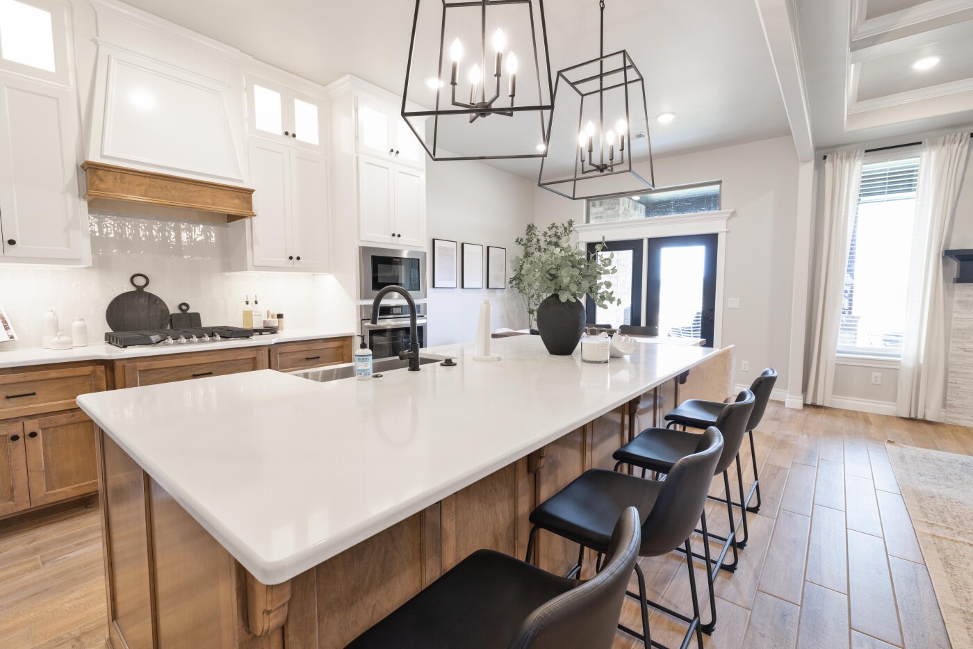 The oversized center island is both striking and functional as a breakfast bar, ample prep space for meals, and storage underneath. This kitchen also consists of a gas cooktop with an oversized vent hood that is vented to the exterior of the home for healthy indoor air. In addition, you will find an electric oven and microwave built into the custom-built cabinetry for easier, convenient access as well as upgraded 3 CM countertops, stainless steel appliances, a timeless, yet trendy tile backsplash, and cabinetry that reaches the ceiling and features under-cabinet mood lighting. In addition, the walk-in pantry expands the storage space in this sizeable kitchen.